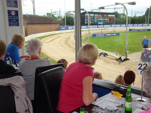 Seated at their tables for lunch, everyone had a track-side seat behind the plate-glass window, which enabled them to watch each race from beginning to end. Their meals and drinks were served at the tables, and they were even able to place their bets there too! Everyone had their own way of picking a dog! For some the luck was in the name, for others the colours, whilst the more expert punters studied the race card for form.