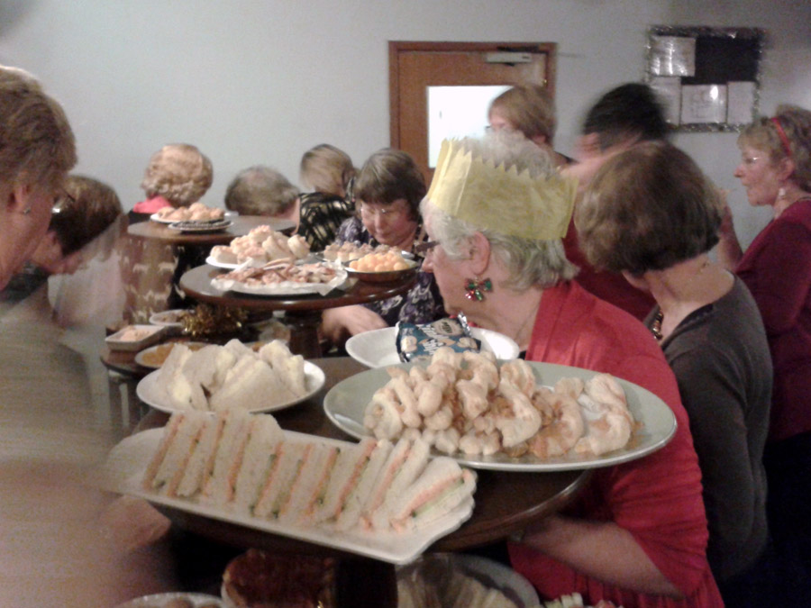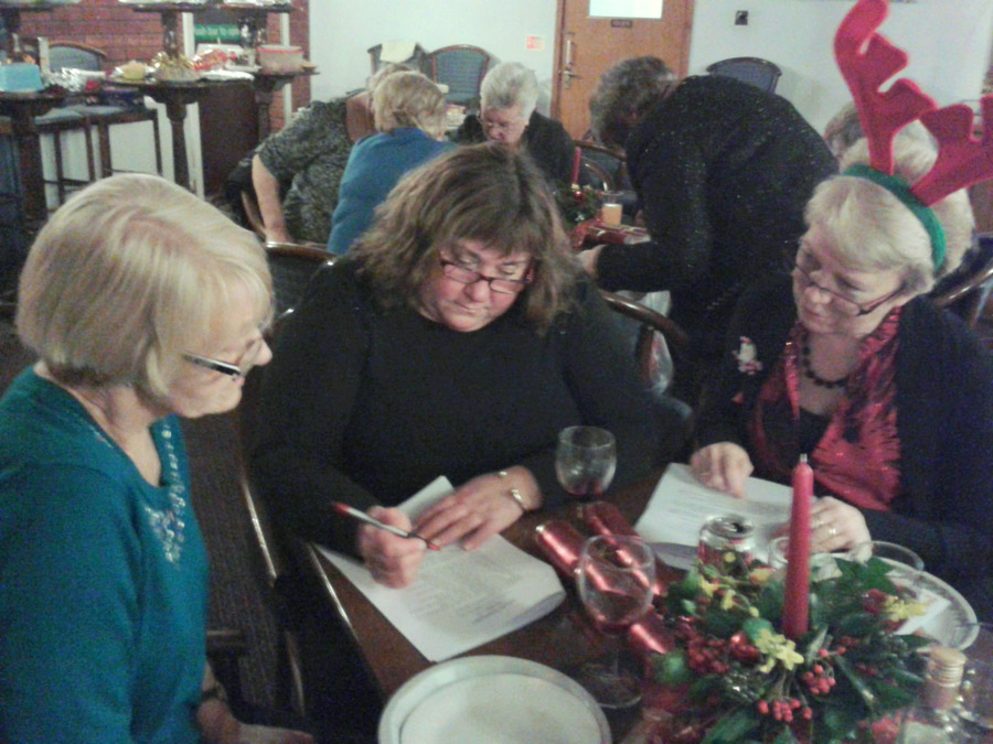 There was a good turnout for our annual Christmas Social, which was a very jolly affair! Everyone was welcomed with a free drink, courtesy of the club, which went down well. The tables were set with festive floral arrangements made by Liz Gulliver, and there were crackers, Christmas music and a bulging sack full of Secret Santa gifts for everyone! The raffle table was loaded with prizes, (not forgetting the Grand Prize of the Christmas Hamper for one lucky member) and the buffet to which everyone had contributed looked very tempting!