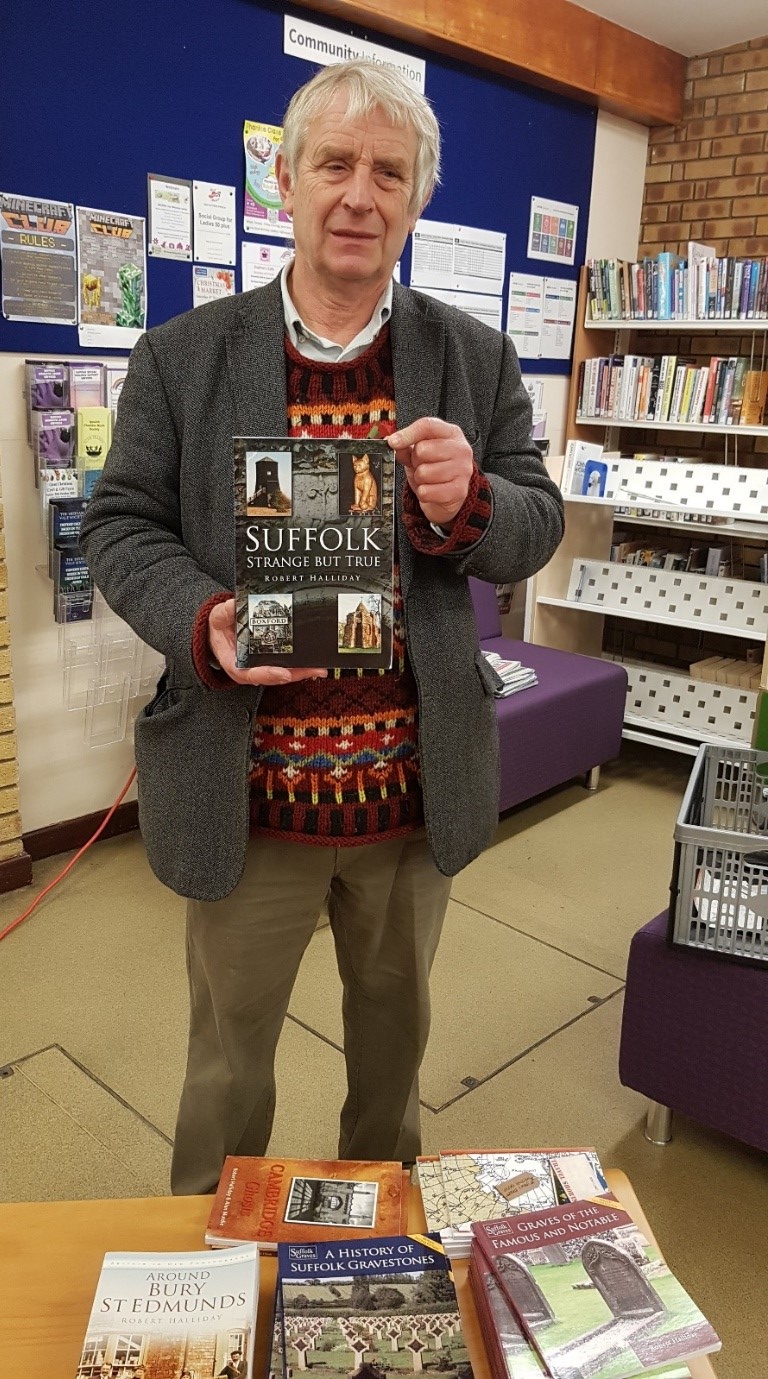 Our November In-meeting was one of a spooky nature! Robert Halliday gave us an illustrated talk entitled “Suffolk Ghosts and Hauntings”, which included several first-hand accounts of his own experiences! There were no headless horsemen or grey ladies involved, but also a number of sightings and unexplained occurrences which had happened to quite ordinary people, and which had been verified by others who had witnessed similar things. Altogether very credible narratives which left many of us with open minds as to whether or not we believe in the supernatural! After the talk there was time for questions and shared experiences, and a chance to buy one of Robert’s several books about Suffolk and its intriguing past.
