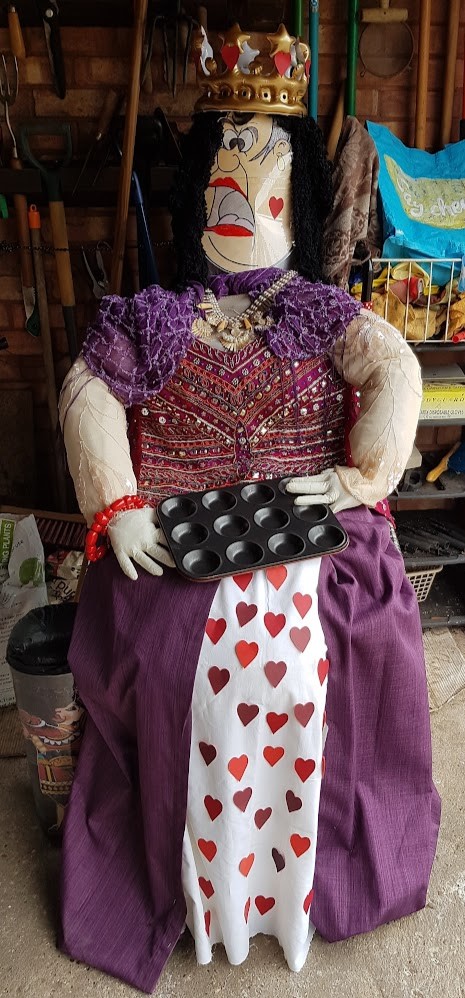 Our next project was Scarecrow-making for the annual Scarecrow Trail, and as it has been a Right Royal Year, we thought something regal would be suitable… so we chose The Queen of Hearts, Disney-style, with an angry expression after the loss of her tarts! Mary, Pat, Shirley and Sue spent a very entertaining morning creating the figure with a lot of laughs along the way!